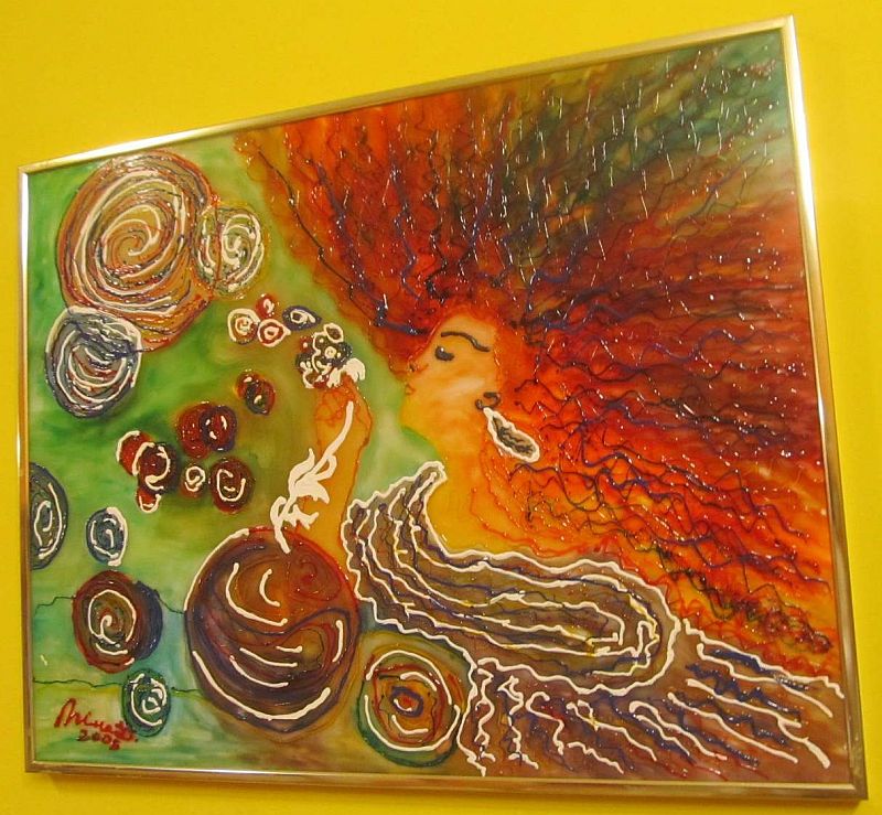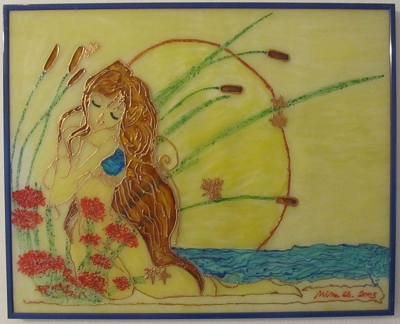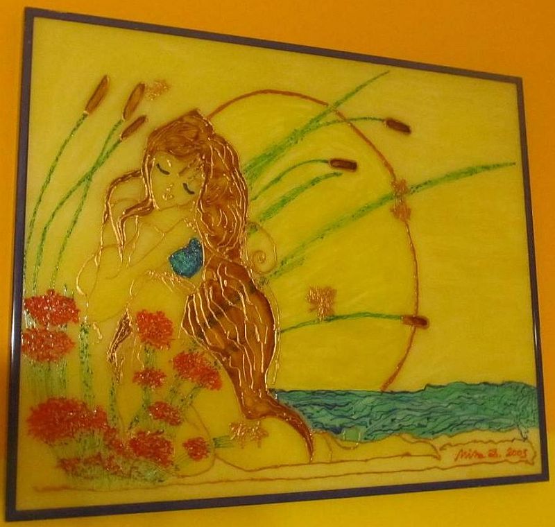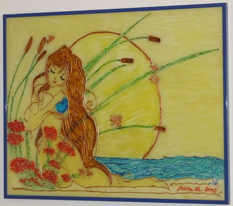 Paintings on glass made in special, self-discovered technique. They give us possibility to discover new angles, energies and observation views on each painting. Colors are soft and light is penetrating them both ways.